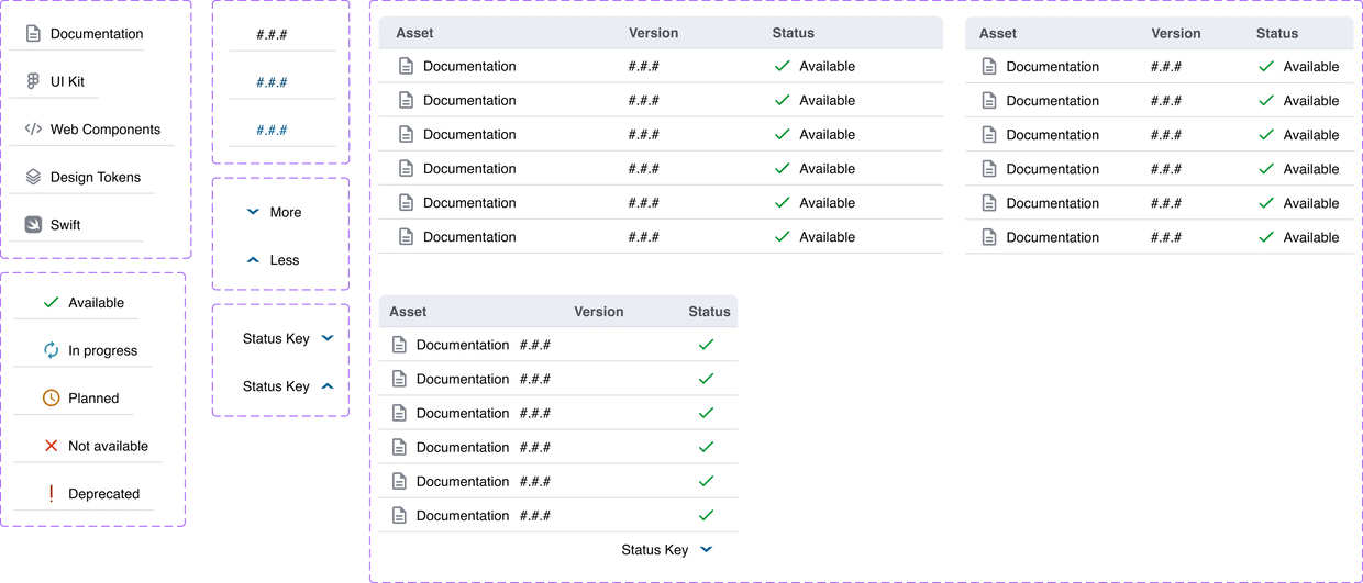 I created a table that categorizes a component or patterns assets by section, version, and status. It is conveniently located at the bottom of each component and pattern page, with clickable links in the version row directing users to the associated asset version.